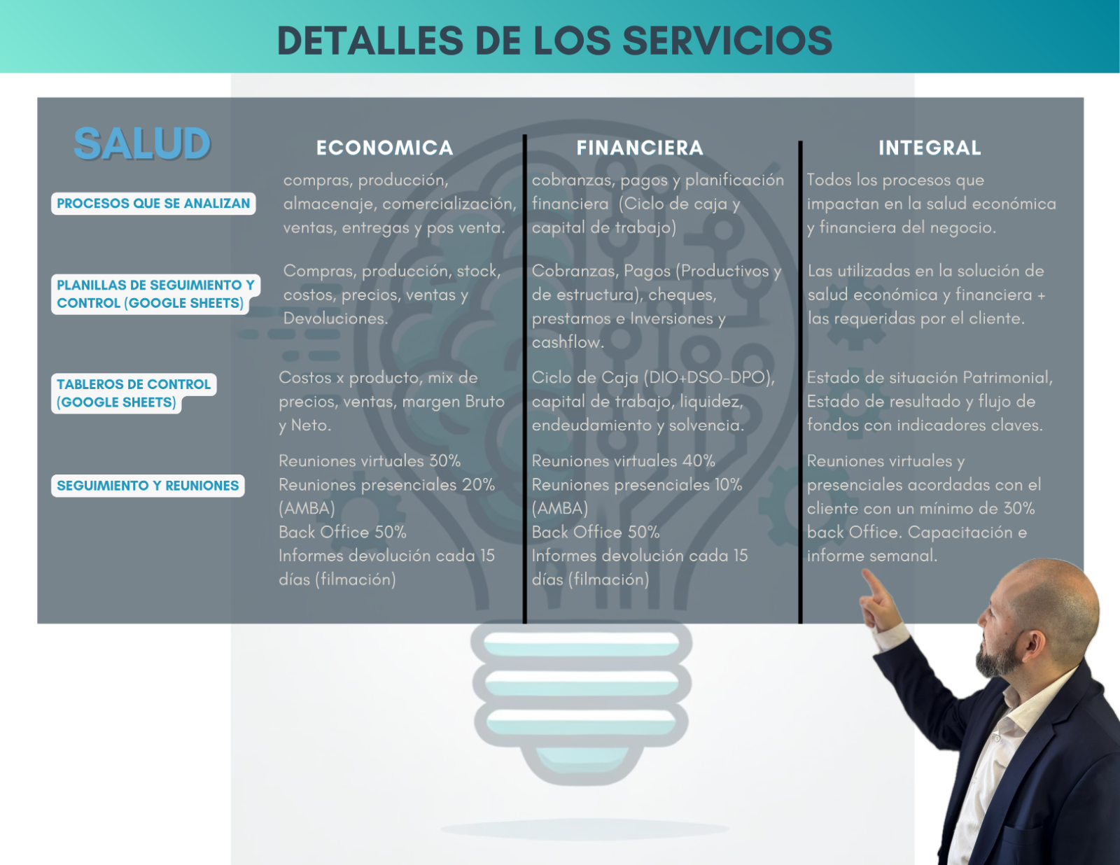 Trabajamos desde los procesos, cuidando la salud económica y financiera del negocio, con una visión integral que contempla tanto el contexto interno como externo de la organización.